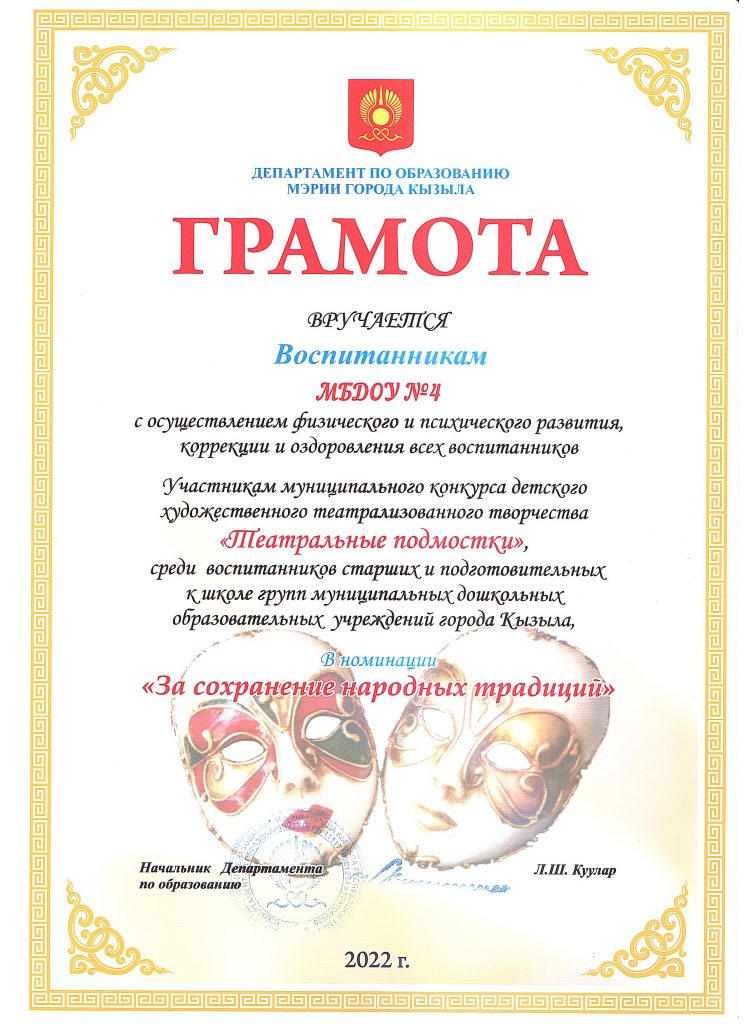 Новости Участие в муниципальном конкурсе детского художественного театрализованного творчества «Театральные подмостки», среди воспитанников старших и подготовительных к школе групп муниципальных дошкольных образовательных учреждений города Кызыла 11.05.2022 / Воспитанники МБДОУ №4 Сказка «Старик Адыган»