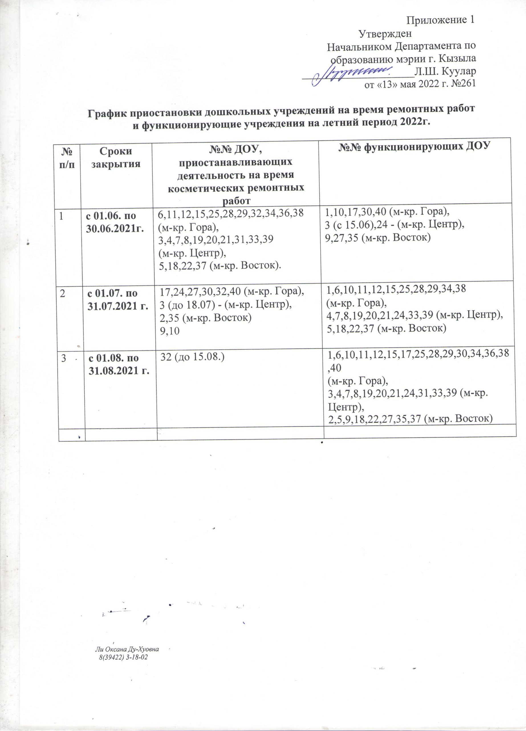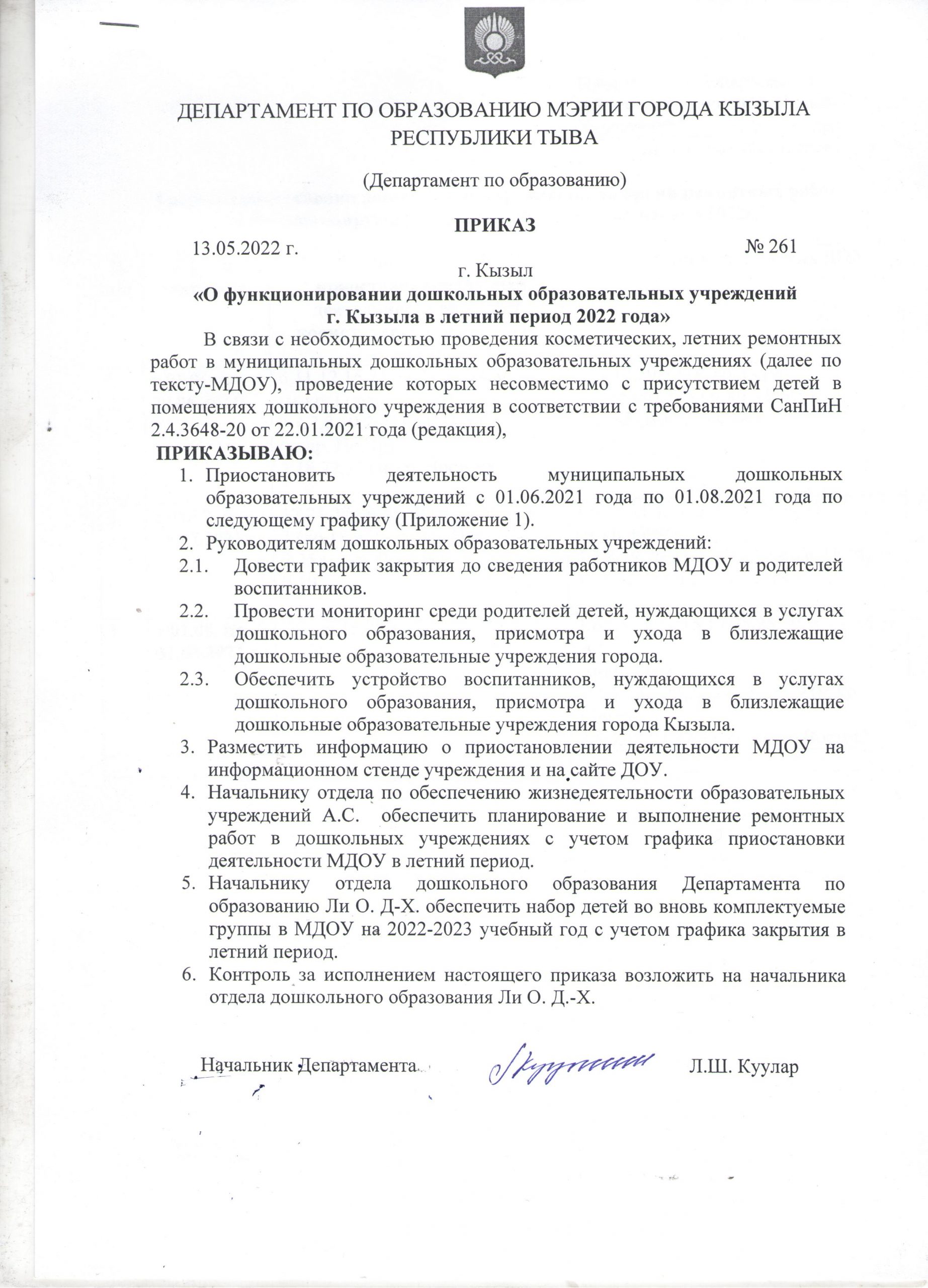Новости О функционировании дошкольных образовательных учреждений г.Кызыла в летний период 2022 года 13.05.2022 / Приказ Департамента №261 от 13.05.2022г. О функционировании дошкольных образовательных учреждений г.кызыла в летний период 2022 года» График приостановки дошкольных учреждений на время ремонтных работ и функционирующие учреждения на летний период 2022г.